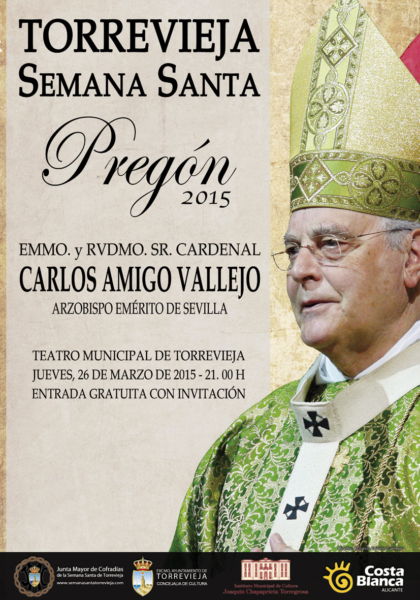 El Cardenal Carlos Amigo Vallejo, Arzobispo Emérito de Sevilla, ha aceptado el nombramiento de la Junta Mayor de Cofradías para pregonar los desfiles pasionales de 2015. Un glosa que marca un auténtico hito en la trayectoria del Pregón de la Semana Santa de Torrevieja, ya que el Cardenal Amigo está considerado una de las voces más relevantes de la Iglesia Católica en materia de religiosidad popular, caracterizado siempre por la defensa y puesta en valor de las cofradías de Semana Santa.
