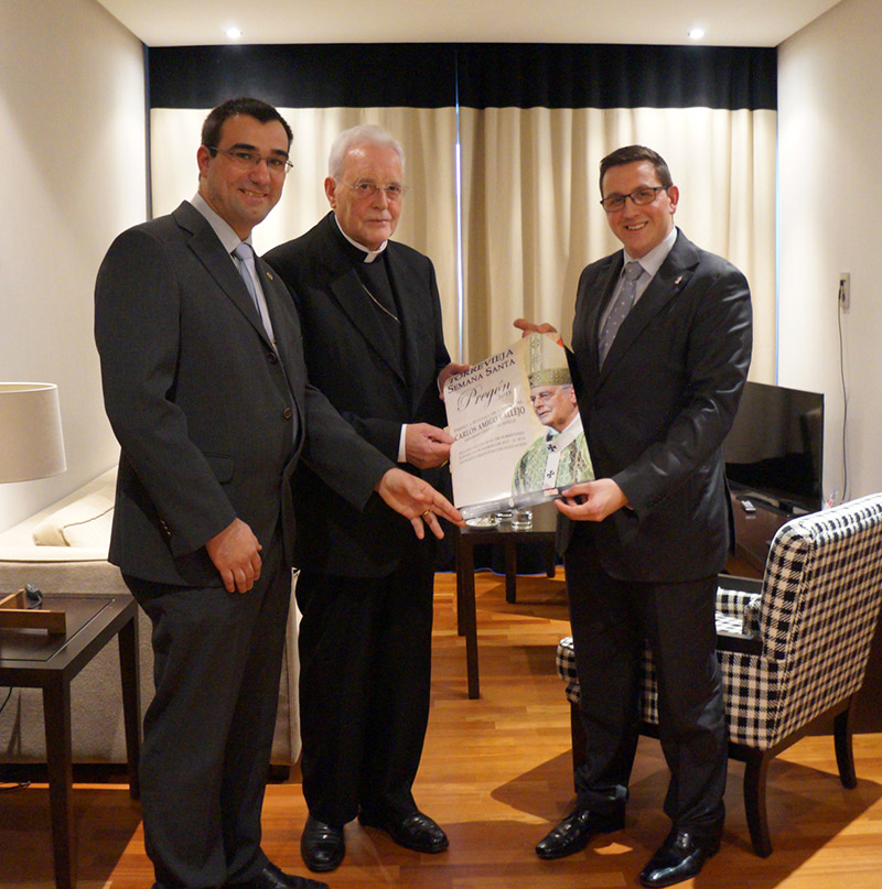 Una delegación de la Junta Mayor de Cofradías, encabezada por su presidente, Jesús Sánchez Seva y el director de Comunicación de la entidad, Antonio Aniorte Guerrero, se reunía ayer en Murcia con el que será el pregonero de la Semana Santa torrevejense 2015, el cardenal Carlos Amigo Vallejo.