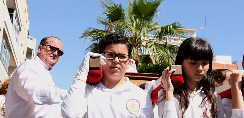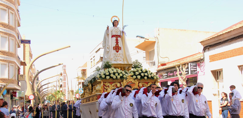 TORREVIEJA. 13-04-2014. Las primeras procesiones de la Semana Santa se han desarrollado con una gran afluencia de público. Primero, la matinal y popular de las Palmas, congregó a muchas personas que con ramos en las manos acudieron a las puertas de la Iglesia de la Inmaculada para el momento de la bendición. Puntual partió entonces el cortejo rumbo al Sagrado Corazón de Jesús, con el paso de Jesús Triunfante, cotitular de la cofradía de la Esperanza abriendo el desfile. Paso que fue el primero de la Semana Santa torrevejense en ser portado por debajo. Le seguía la cofradía de San Juan Evangelista, primero, con su trono infantil que porta los Evangelios, y después, la imagen titular, de blanco riguroso, como no volverá a verse hasta el Domingo de Resurrección. La procesión discurría así rodeada de muchas personas que no querían perder detalle de la recreación de la entrada del Señor en Jerusalén.