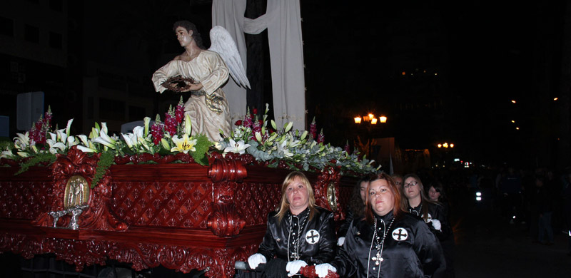 Ya por la tarde salían a las calles los primeros capirotes de este año. Aperturando la procesión vespertina iba, como es costumbre, la cofradía de la Convocatoria, que este año recupera el conocido como “cuerno”, una trompeta sorda que anuncia la muerte del Señor. Tras el Ángel Pasionario que ocupa el centro del paso, siguió la cofradía de Ntro. Padre Jesús Triunfante y Ntra. Sra. de la Esperanza y de la Paz, que procesionó como de costumbre únicamente con la advocación mariana, y donde todas las miradas se centraron en el nuevo techo de palio que estrenaba, y que ha sido realizado por Bordados Artísticos Paredes de Guardamar del Segura, y también en su trono, que ha sido completamente bañado en plata y estrena la candelería de cola, realizada en los talleres de Benedicto Martínez de Redován.